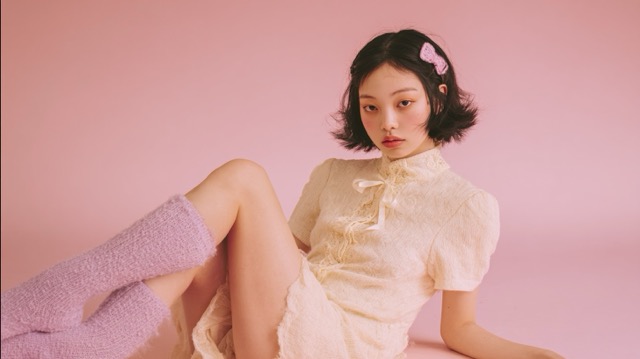 A trendy fashion portrait of a young East Asian woman with a short black bob hairstyle and a pink bow clip. She is wearing a delicate cream-colored lace dress with a ribbon tie and lavender fuzzy leg warmers. She is posing reclining on a soft pink background. High-fashion studio lighting, soft pastel color palette, aesthetic Y2K coquette style, high-resolution photography, clean minimalist composition.