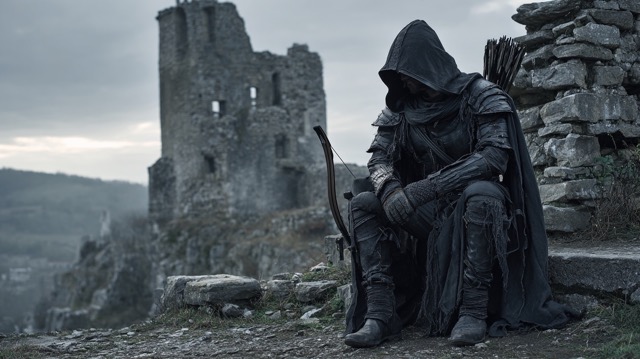 A somber cinematic still of a hooded rogue or assassin dressed in weathered black leather armor and a ragged cloak, sitting dejectedly on a stone edge. A quiver of arrows is visible on his back. In the background stand the grey, desaturated ruins of a medieval stone castle under a gloomy overcast sky. Dark fantasy atmosphere, gritty texture, realistic medieval setting, muted colors, 8K resolution.
