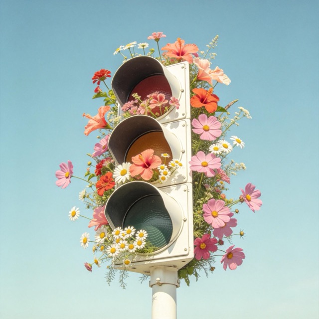 A creative and surreal shot of a white vintage traffic light standing against a clear pale blue sky. The traffic light is overflowing with a lush arrangement of colorful flowers, including pink cosmos, orange hibiscuses, and white daisies, blooming from each lens. Dreamy summer vibe, whimsical art installation style, soft natural sunlight, vibrant floral textures, high detail, 4K.