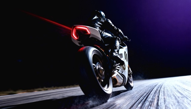 Low-angle dramatic shot of a rider on a white modern sport motorcycle speeding down a highway at night. Seen from behind, the glowing red V-shaped taillight creates a bright streak. The road reflects the moonlight, and the sky is a deep purple-black. High-speed motion, cinematic lighting, sharp focus on the rear tire and exhaust, sleek metallic textures, cyberpunk night vibe, 8K.
