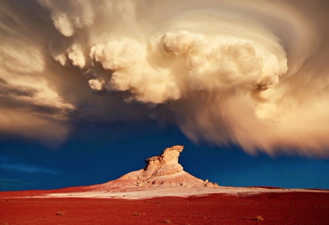 An epic landscape photograph of a unique rock formation standing in a vast red desert under a colossal, swirling supercell storm cloud. The massive white cloud formation glows with warm sunlight against a dark blue sky. Dramatic contrast between the earthy red ground and the atmospheric storm. National Geographic style, wide-angle lens, intense natural power, ultra-detailed, 8K.