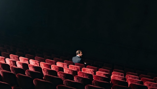 Cinematic wide shot of a man in a dark suit sitting alone in the middle of a vast, empty movie theater with rows of plush red velvet seats. The lighting is dim and moody, with a soft spotlight highlighting the red texture of the chairs. Themes of loneliness and contemplation, deep shadows, symmetrical composition, film noir aesthetic, high contrast, 4K.