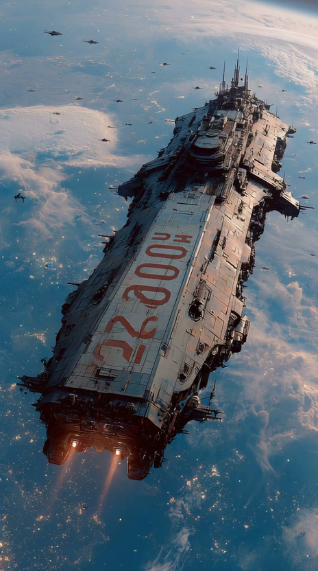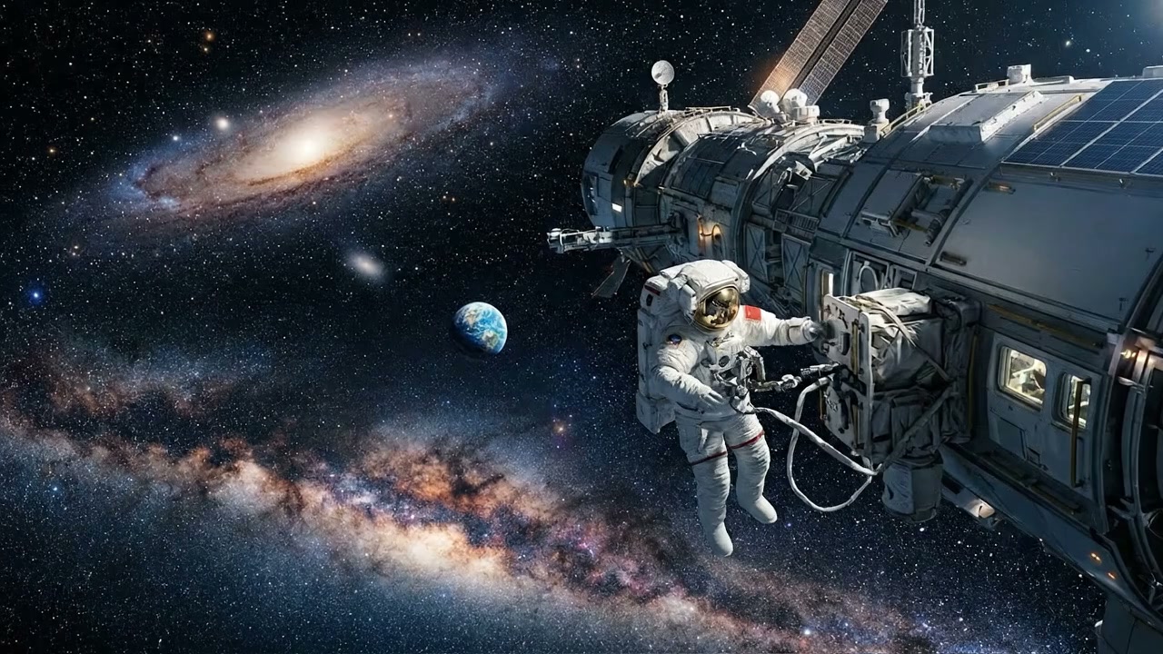 The vast universe, spaceships, and astronauts floating.
