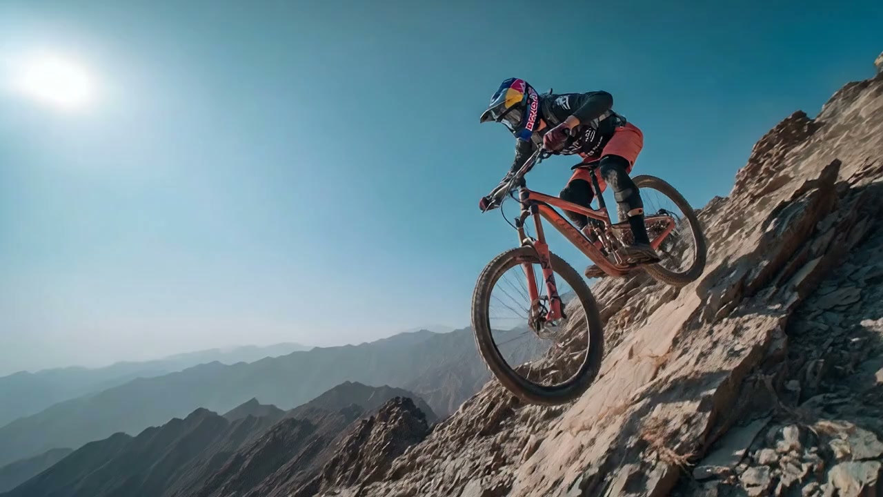 Showcasing the dynamic scene of mountain bikers speeding down steep slopes. to intense gravity. High-fidelity textures, epic scale, slow and majestic camera pan, 4k, realistic sci-fi aesthetic.