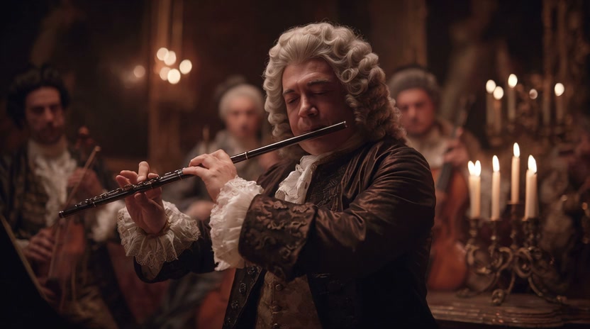 Cinematic close-up of a flutist in a Baroque wig and period costume playing a wooden flute. Dimly lit chamber with warm candlelight, bokeh background of a string ensemble. Elegant, dramatic, historical film aesthetic, 4K.