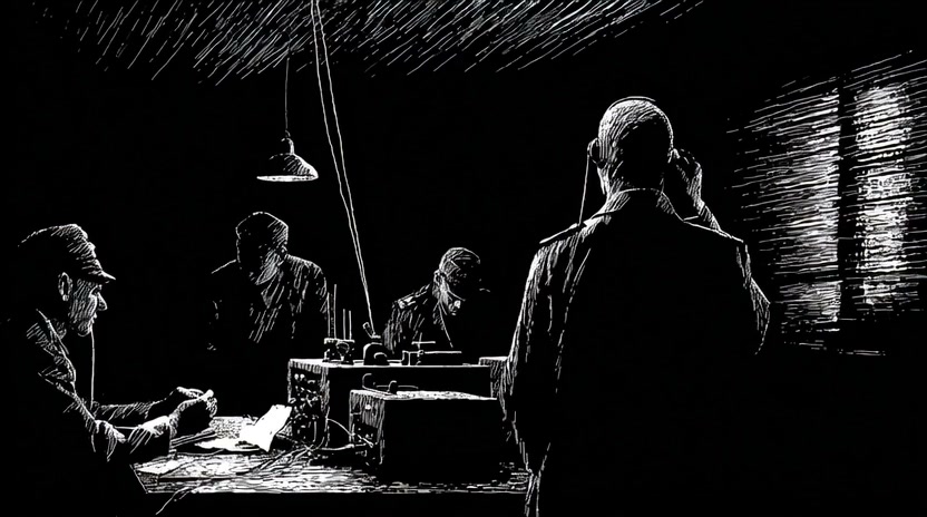 High-contrast black and white woodcut style animation. A dark, secret radio room with silhouetted officers. Harsh Chiaroscuro lighting, grainy hand-drawn texture, atmospheric noir aesthetic, dramatic shadows.