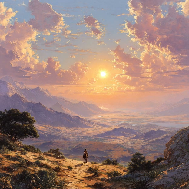 Studio Ghibli style animation of a lone traveler walking on a mountain ridge, overlooking a vast valley at sunset. Golden sun hanging low in a sky filled with fluffy pink and orange clouds. Detailed landscape with rolling hills, distant mountains, and soft warm lighting. Peaceful and adventurous atmosphere, high quality, 4K.