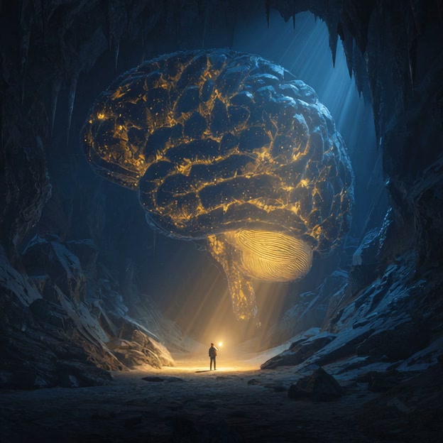 Cinematic surreal shot of a massive, glowing human brain floating inside a dark, rocky cavern. A tiny explorer holding a torch stands below, gazing up in awe. Golden light pulsating through the brain's neural pathways. Dramatic god rays, deep shadows, cosmic mystery, hyper-realistic textures, epic scale, 8K.