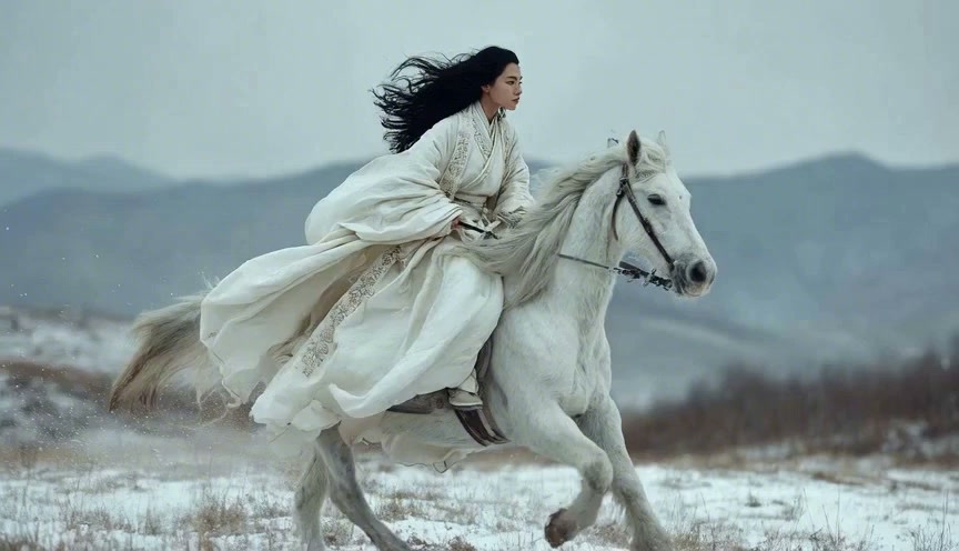 A lonely woman riding a horse